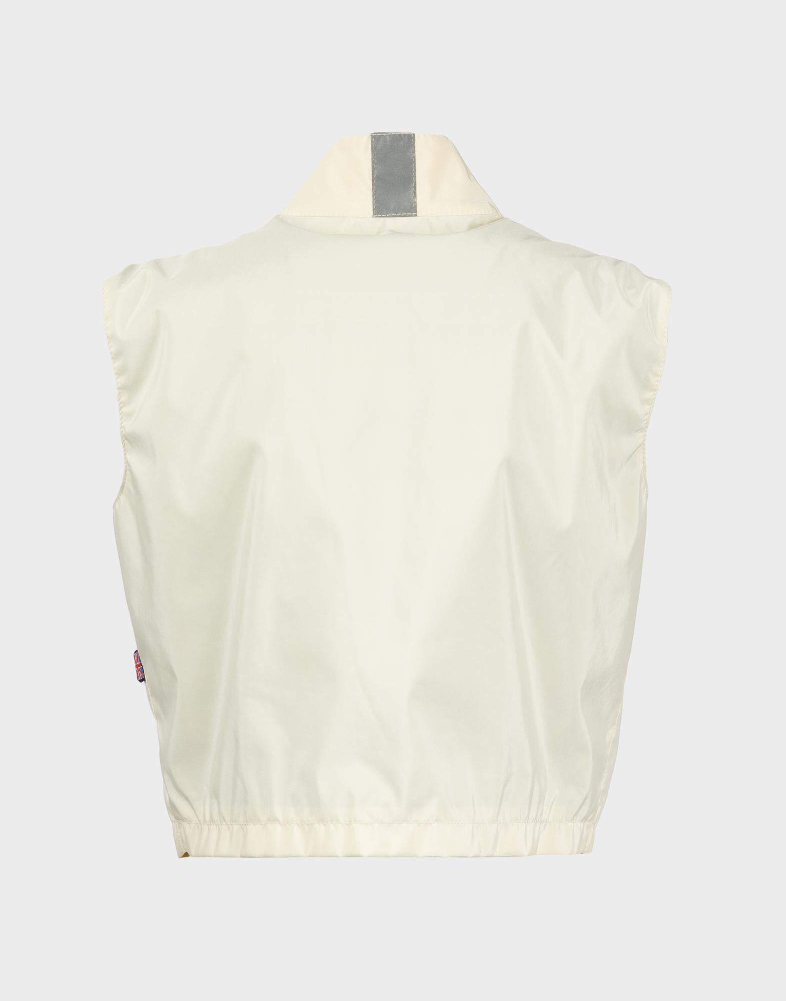 Belstaff, smanicato avorio in 100% nylon con due tasche frontali e chiusura a zip. La fodera è in 100% cotone con motivo tartan. Taglia 44