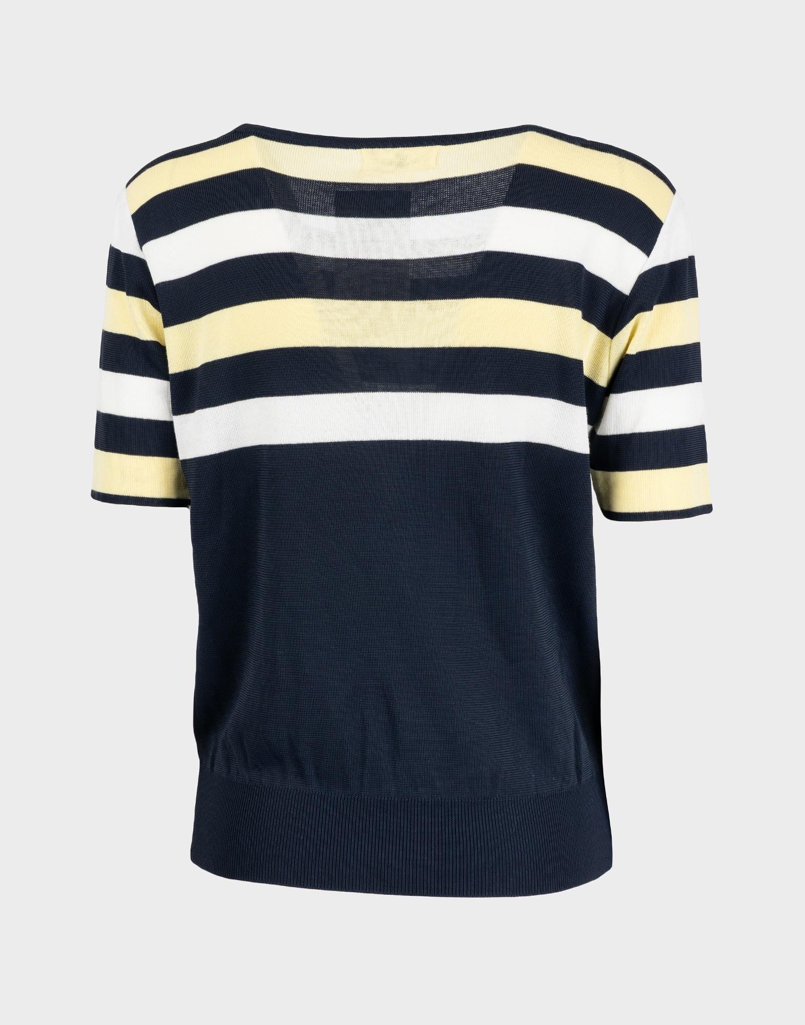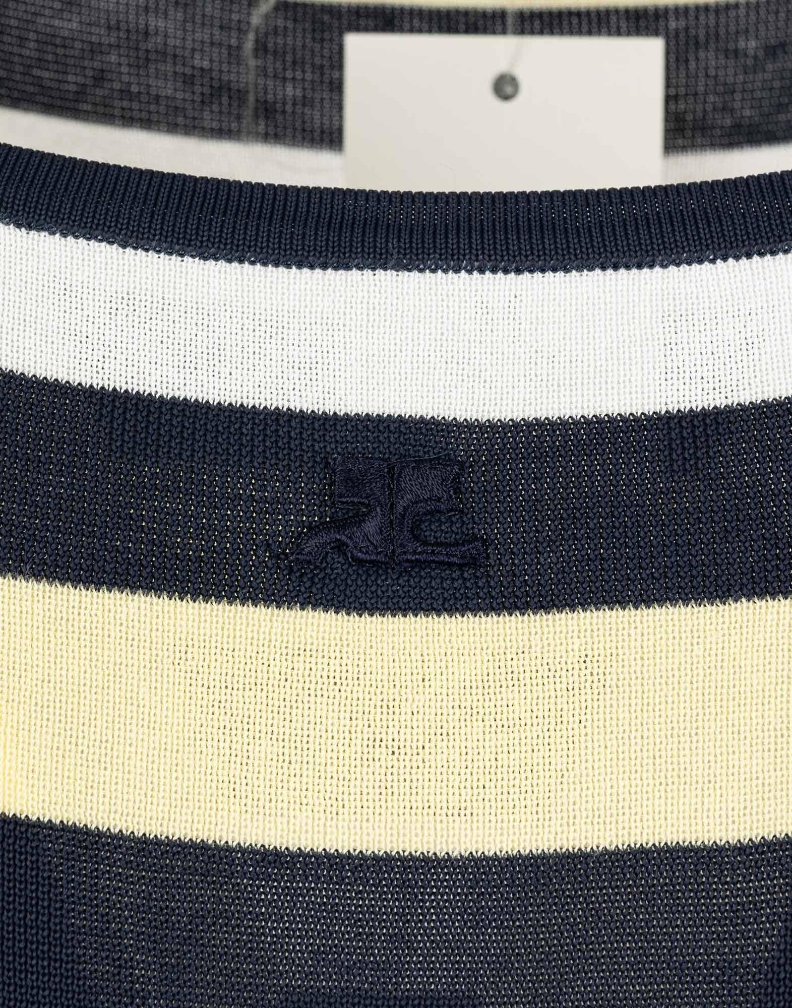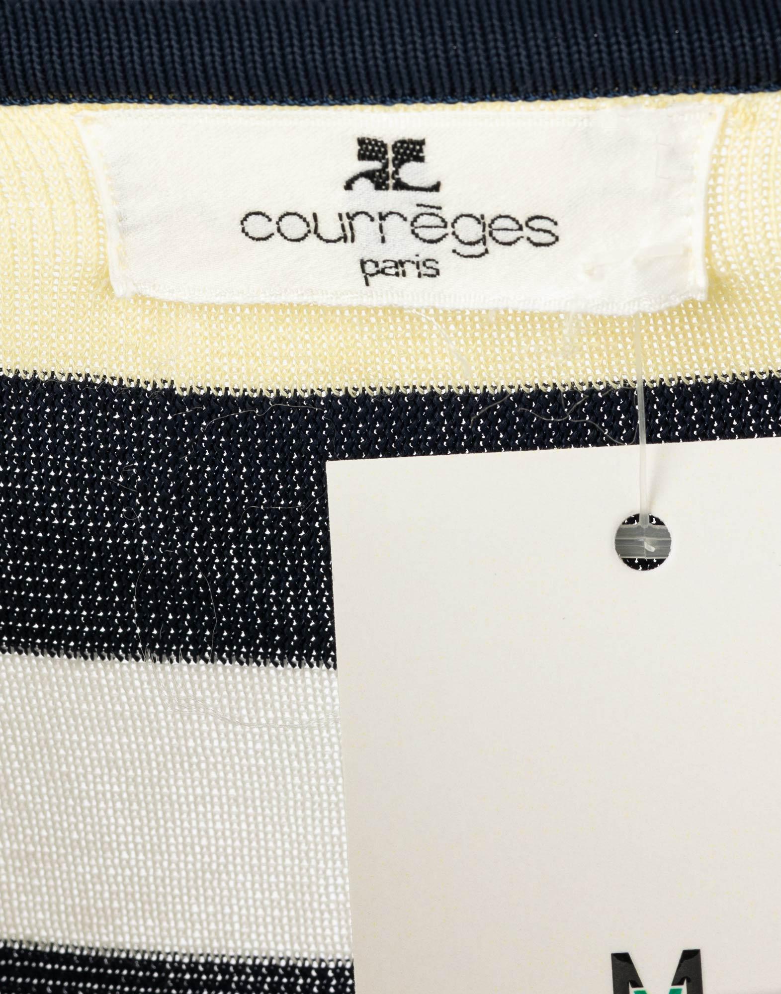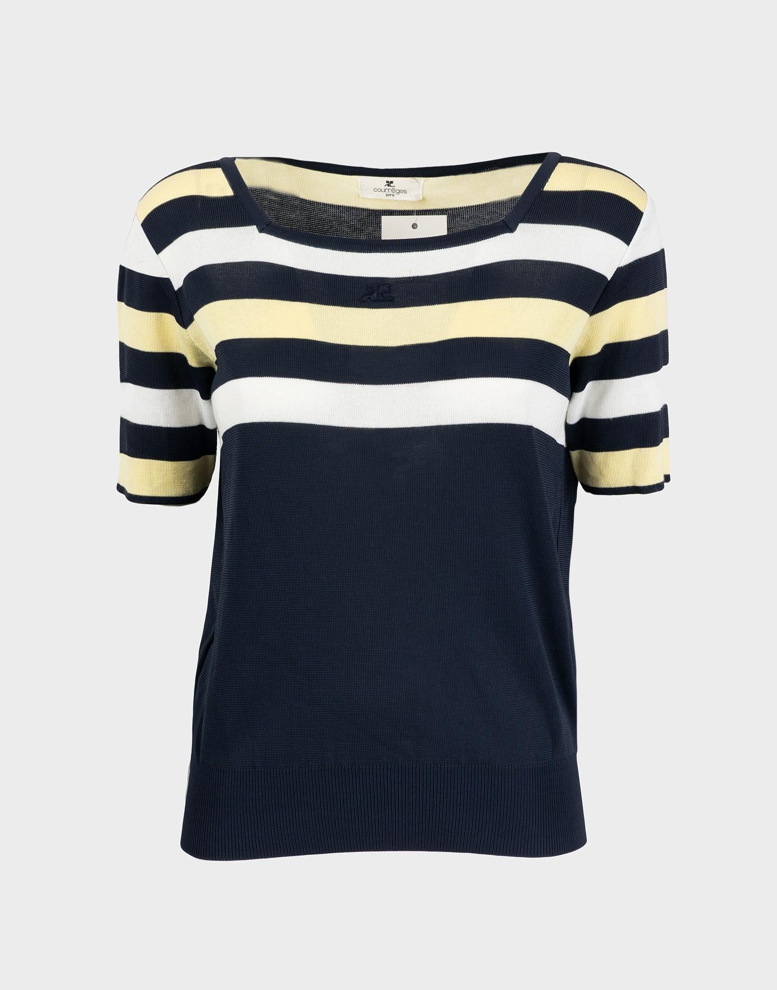 Courreges, t-shirt in acetato anni '80 blu con righe bianche e gialle. Scollo quadrato. Logo ricamato sul davanti. Taglia 42IT. Spalle: 38 cm Busto: 46 cm Lunghezza: 53 cm