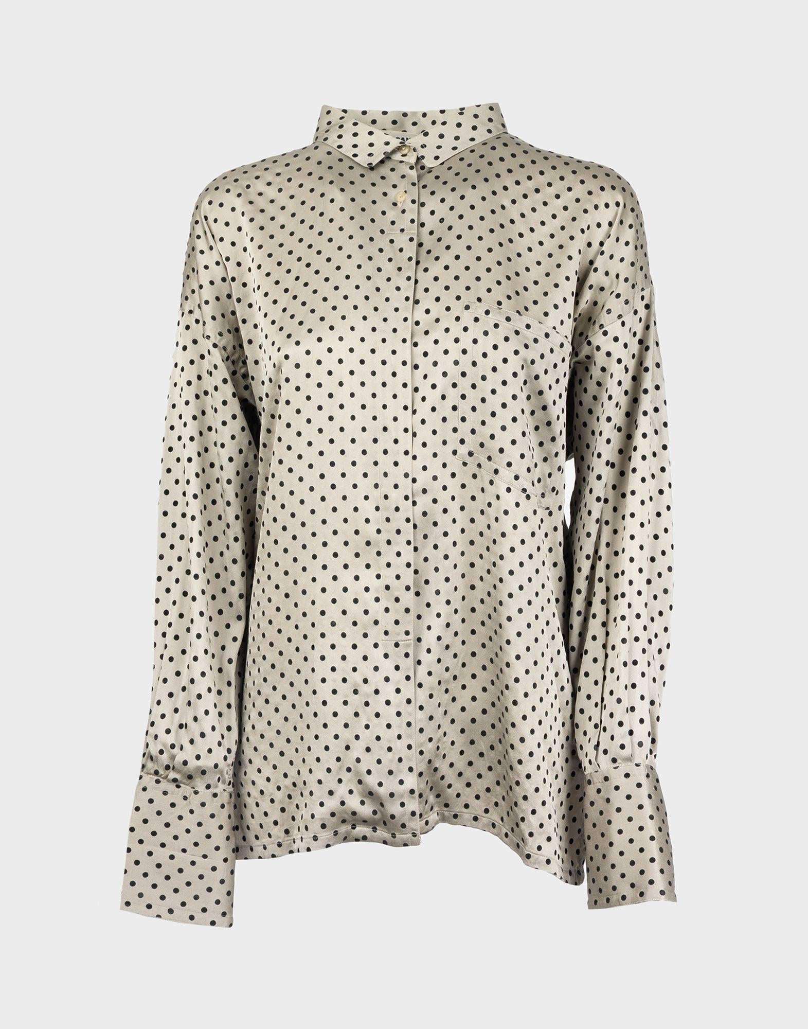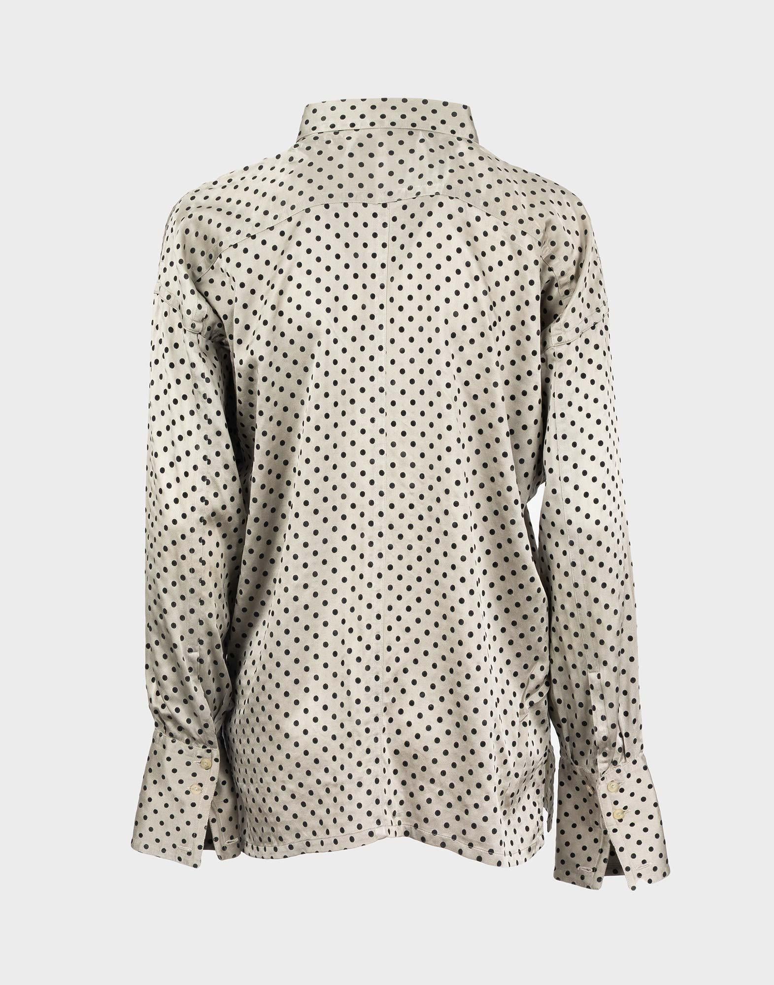 Jil Sander, blusa di colore grigio a fantasia a pois, realizzata in 100% seta. Chiusura con bottoni e taschino sul petto. Taglia 42IT. Spalle: 60 cm Busto: 60 cm Maniche: 56 cm Lunghezza: 68 cm