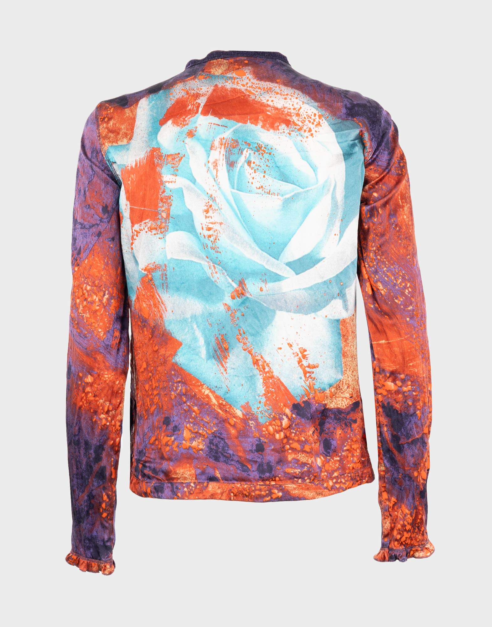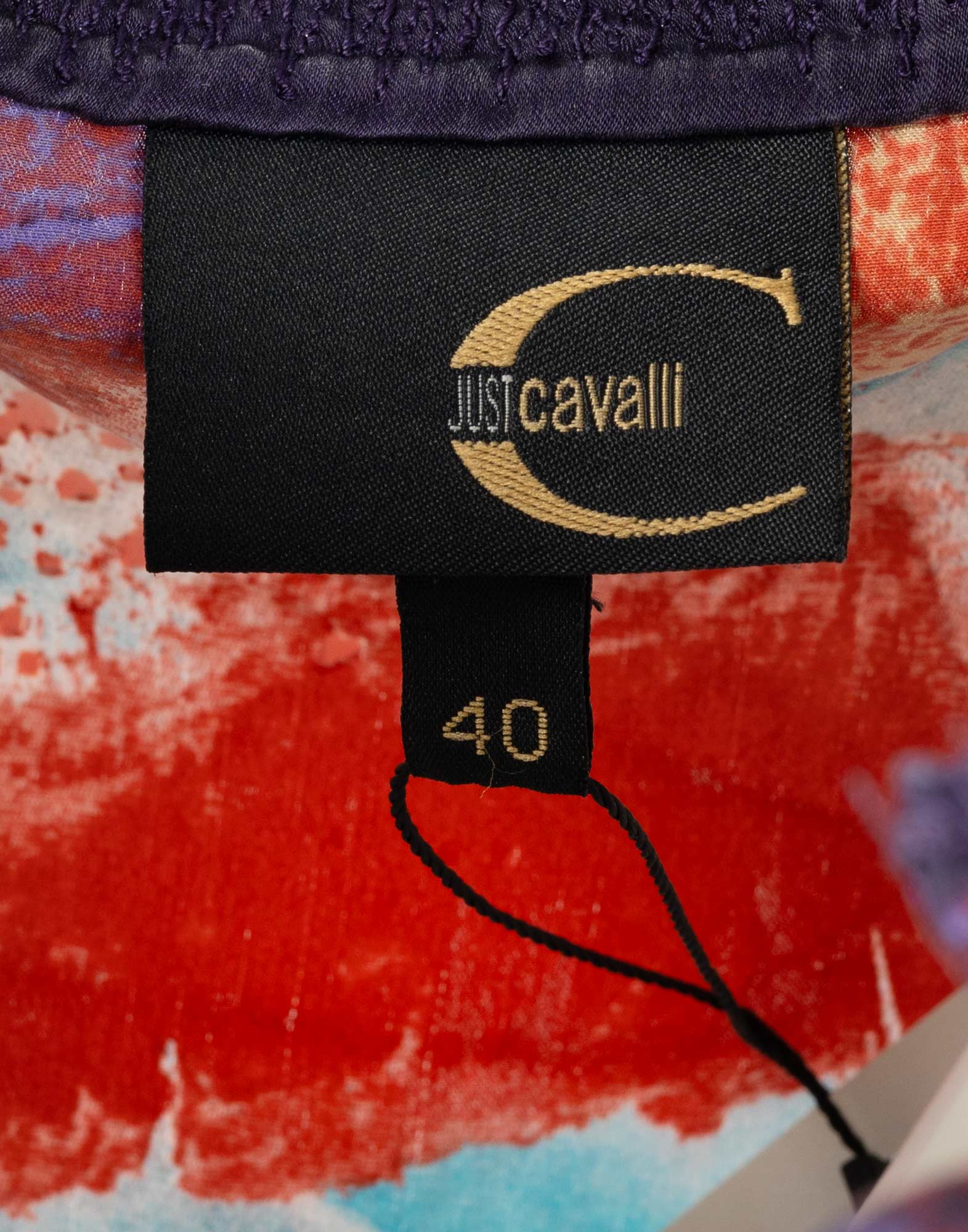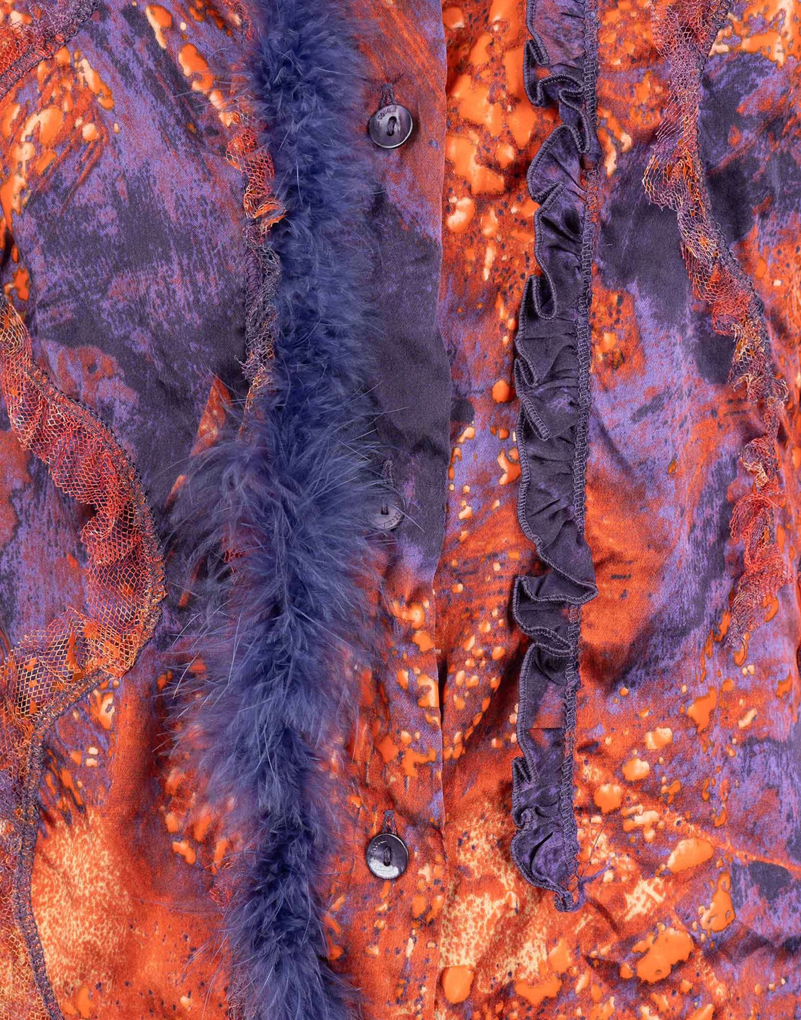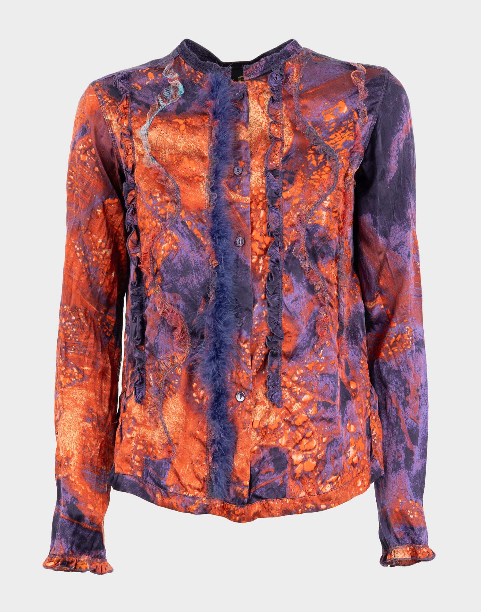 Just Cavalli, shirt made of 95% silk and 5% polyester with an abstract purple and orange pattern. Features purple feather details and ruffles on the front. Button-up closure. Size 40IT.