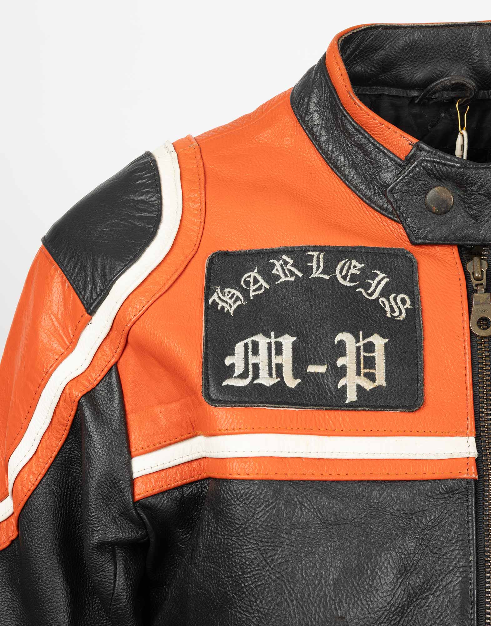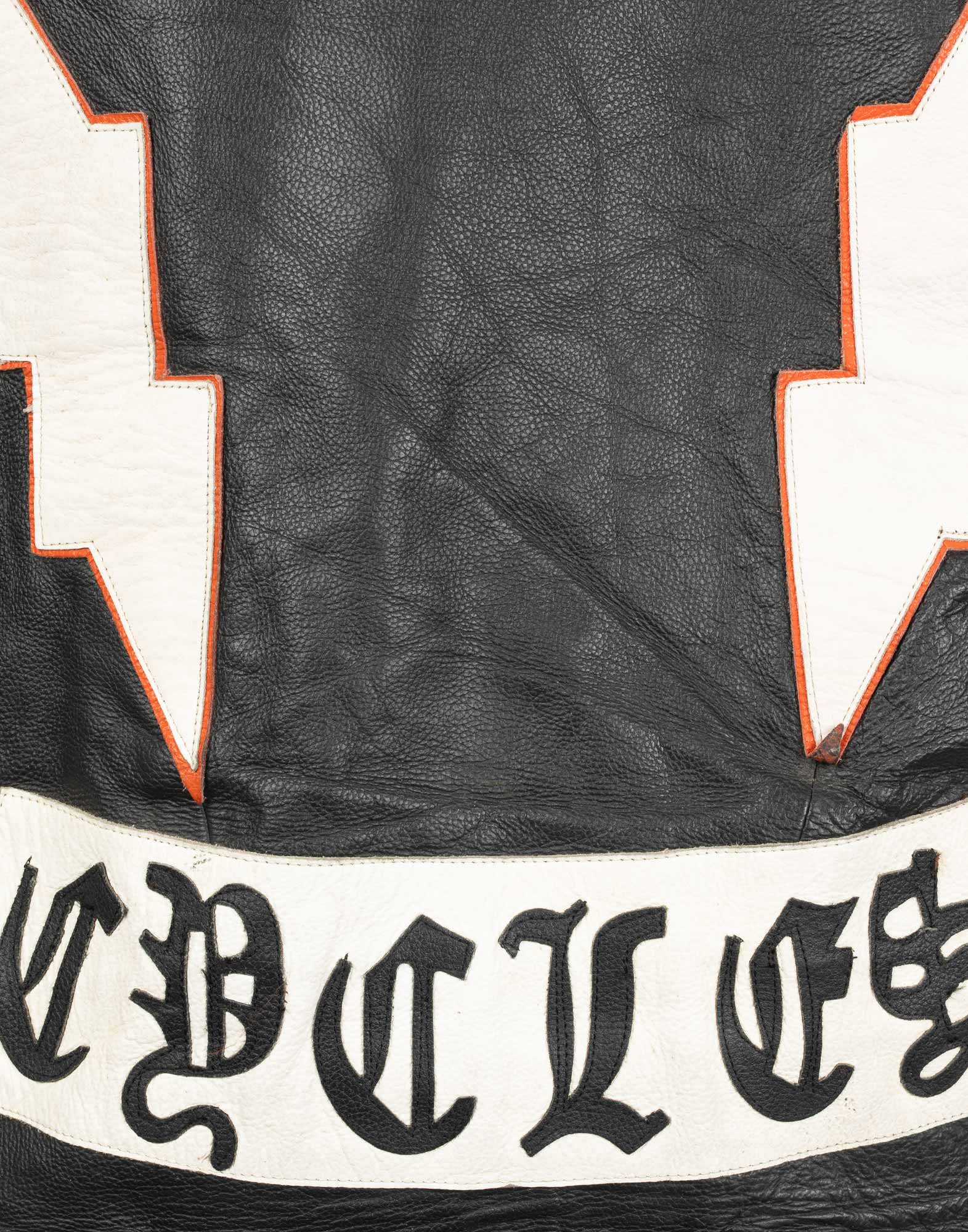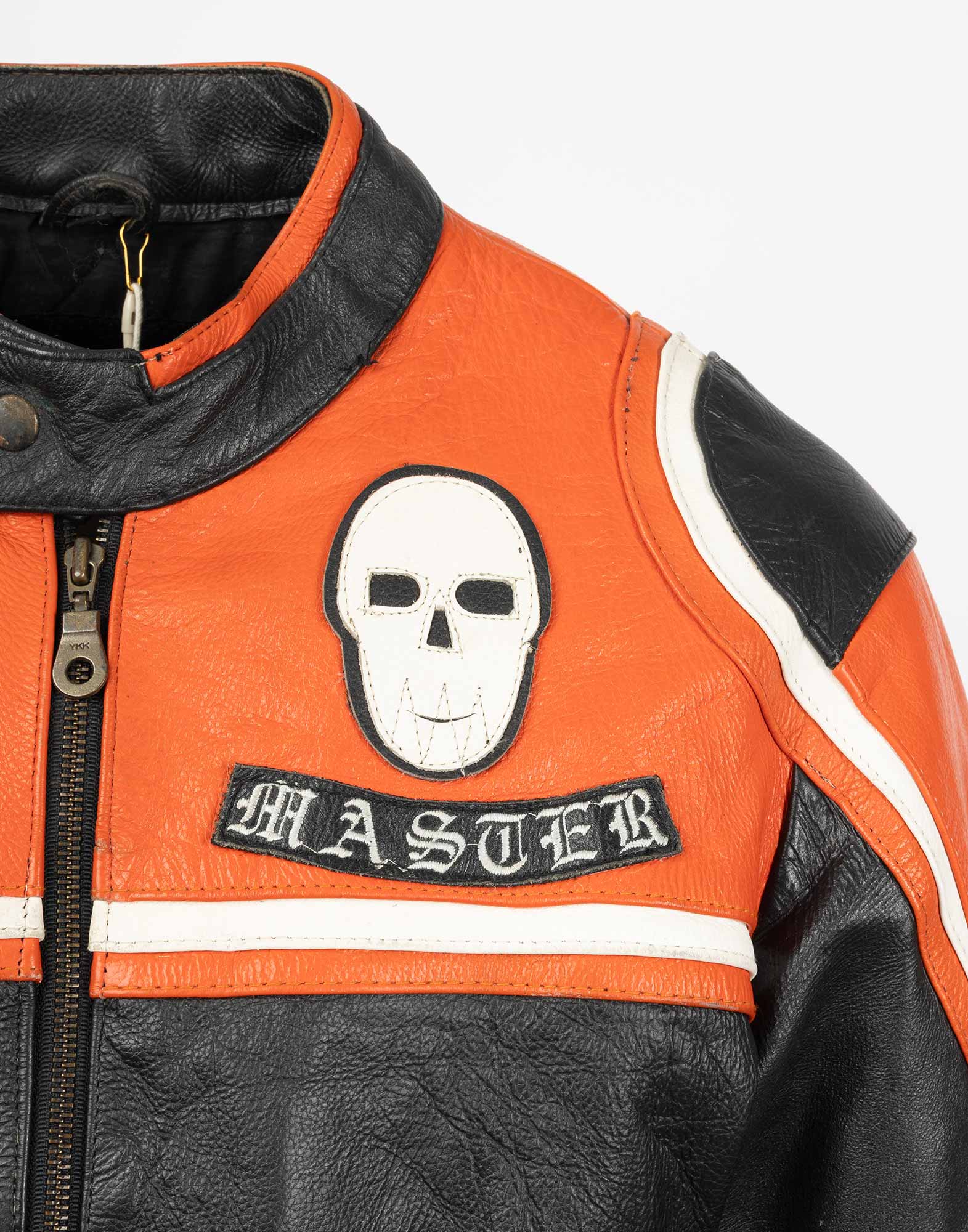 90s vintage motorcycle jacket in genuine leather, featuring a bold stylized skull on the chest and gothic lettering inspired by classic biker culture. Size XXL.
