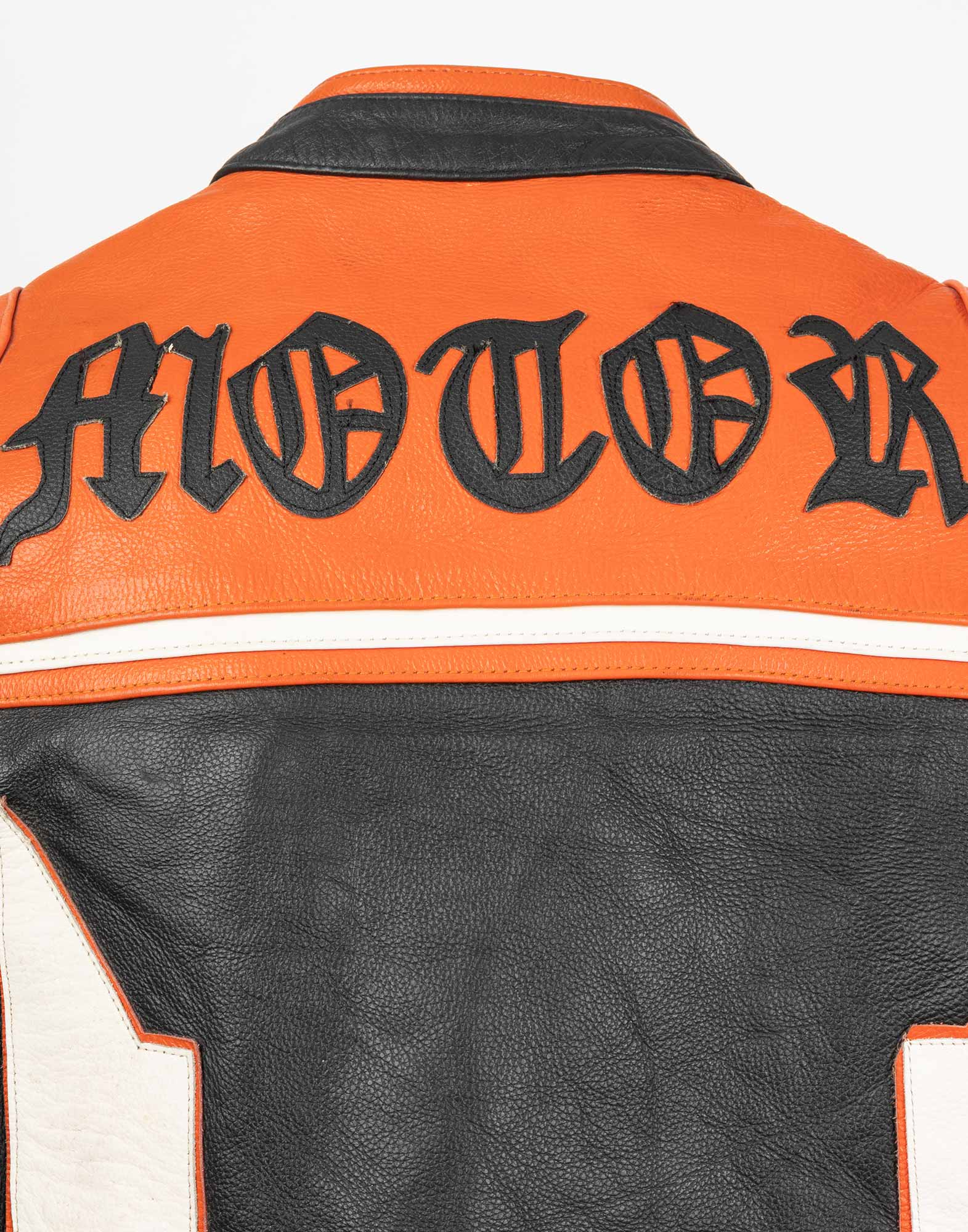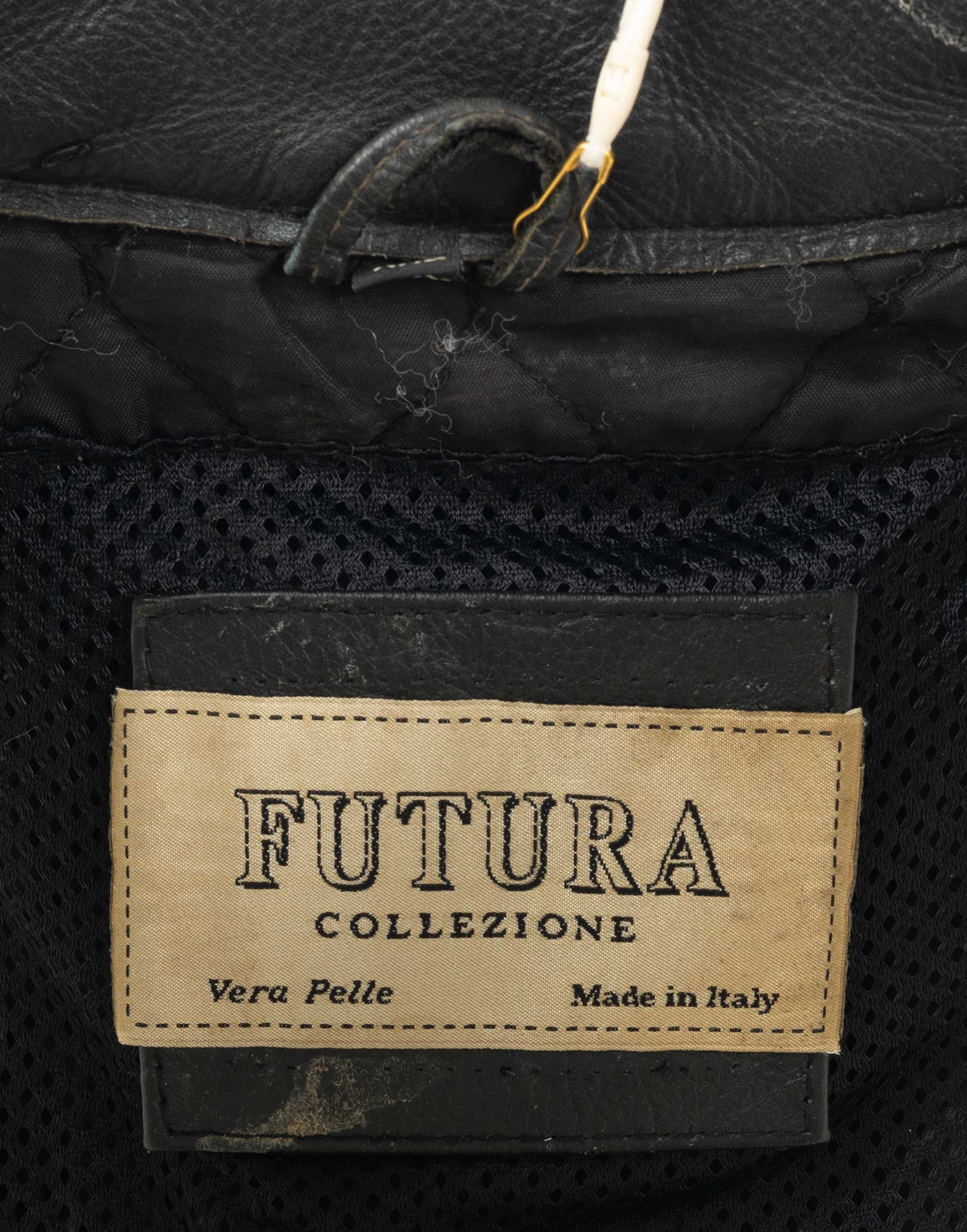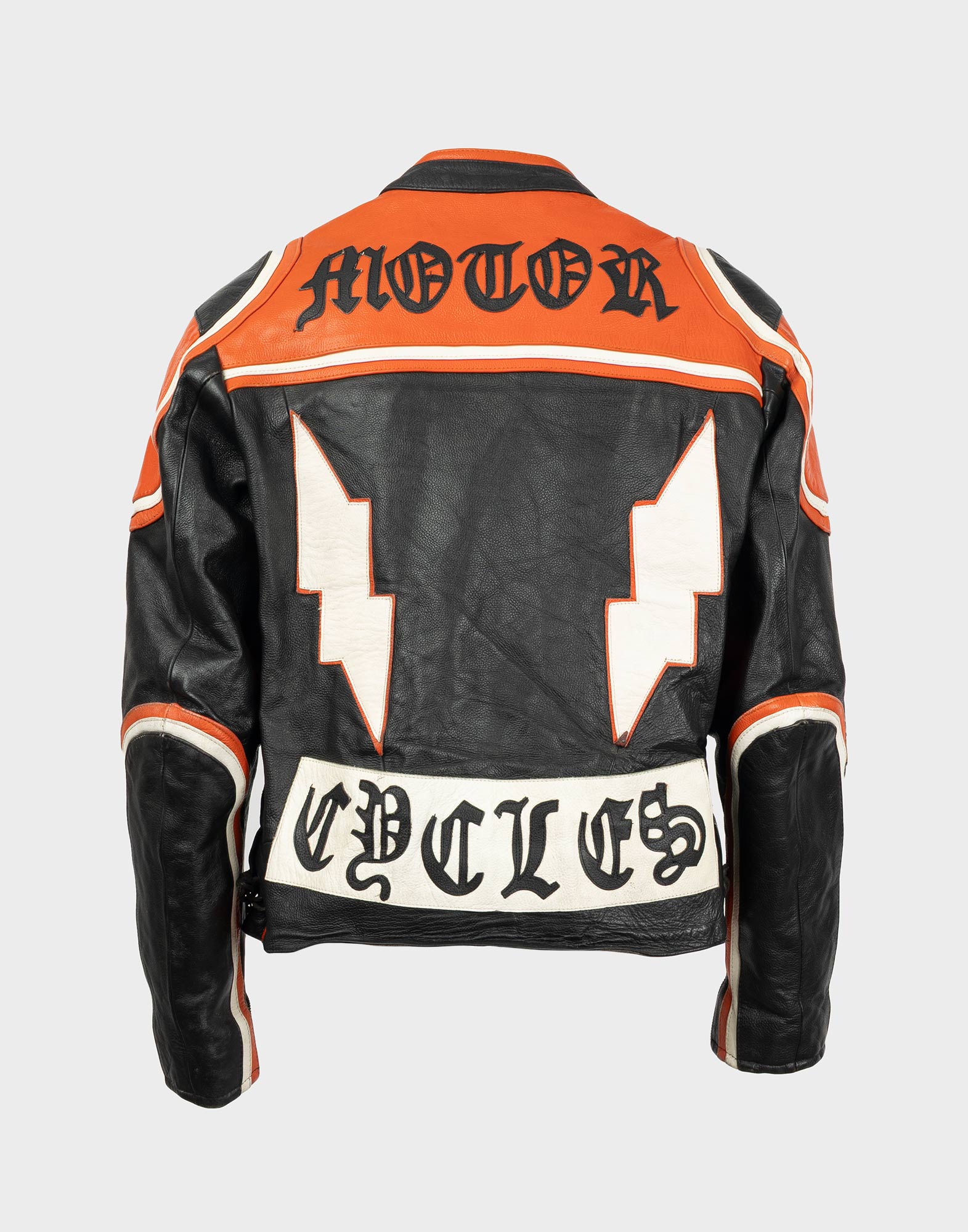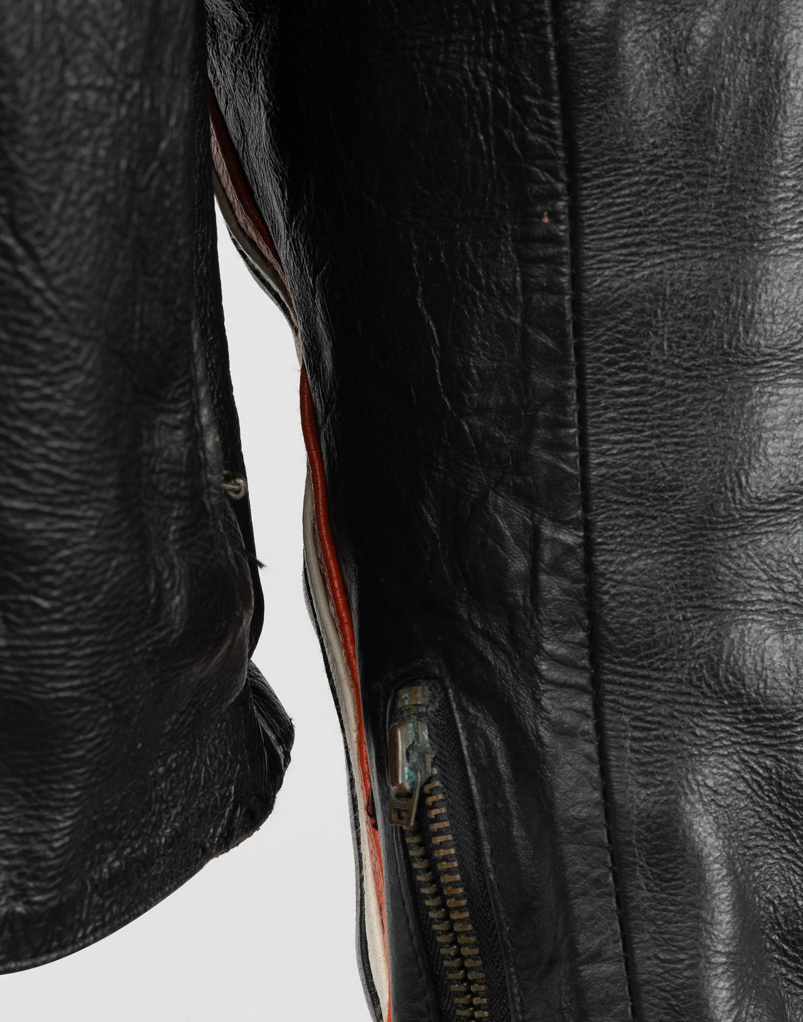 90s vintage motorcycle jacket in genuine leather, featuring a bold stylized skull on the chest and gothic lettering inspired by classic biker culture. Size XXL.