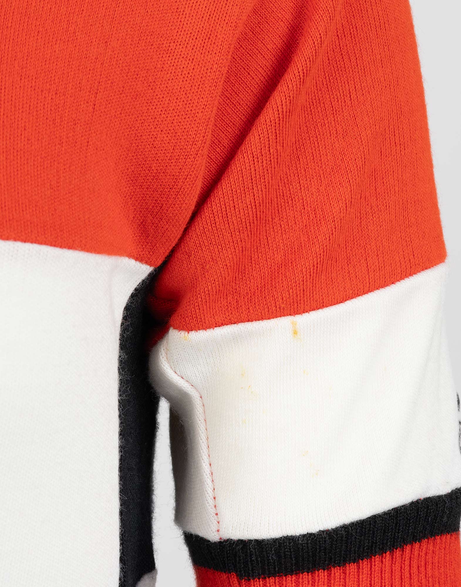 Vintage 1970s Cilo Aufina multicolor cycling t-shirt in black, red, white, and grey with zip collar in 100% wool. Features rear pockets. Size S. Small stain present.