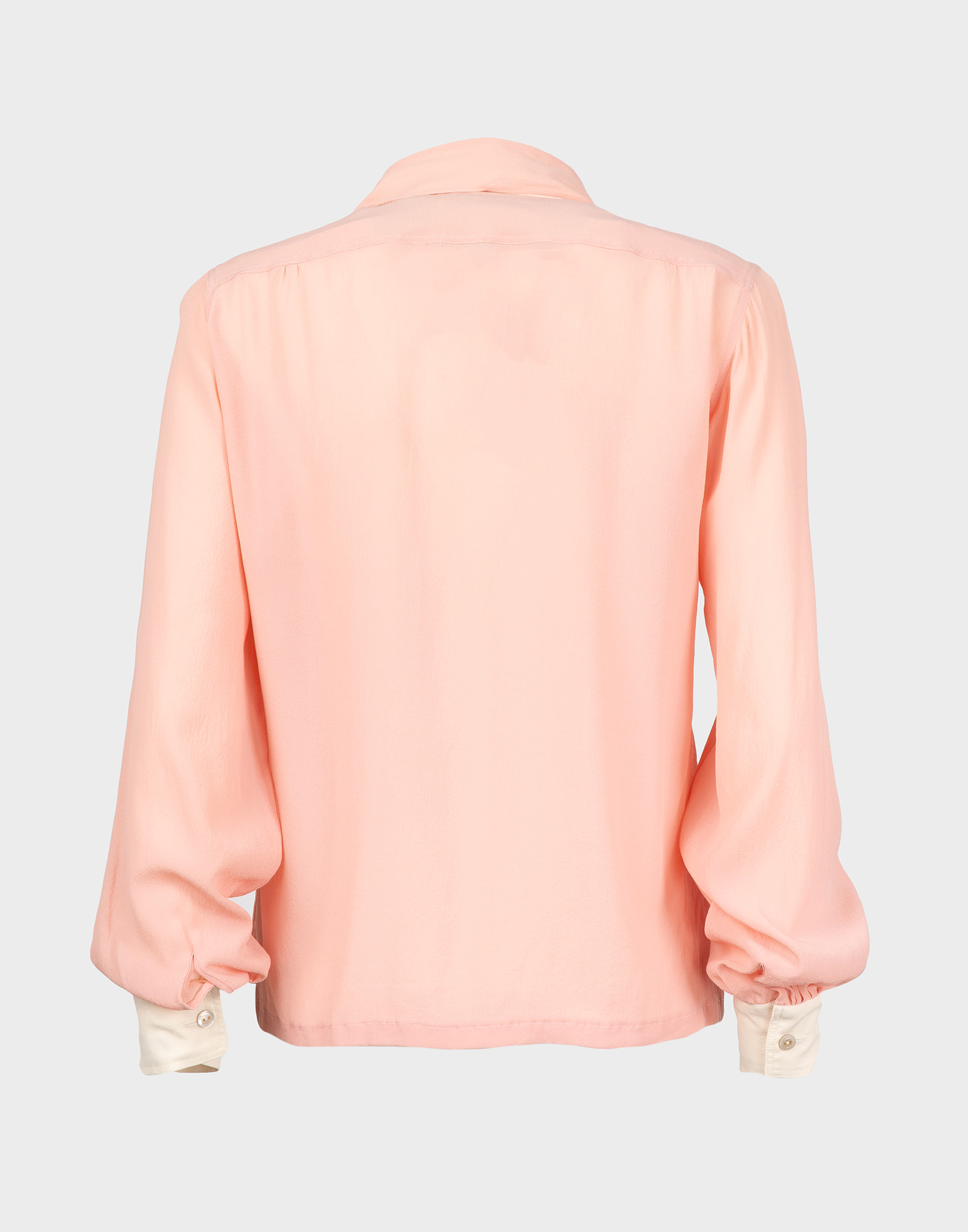 Romantica camicia Louis Feraud rosa in seta anni ’90 con colletto e polsini bianchi a contrasto. Fiocco al collo per un tocco chic. Taglia S.