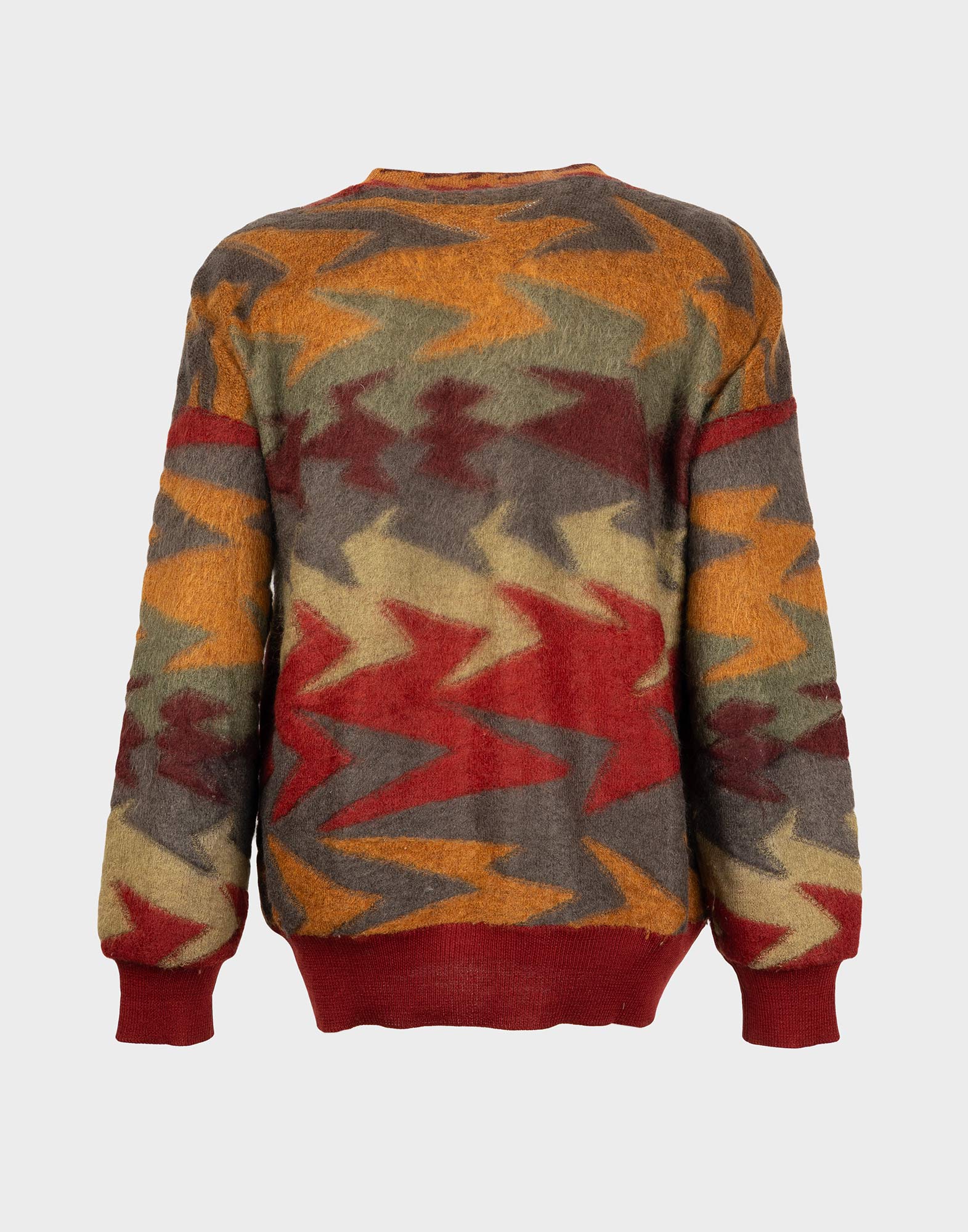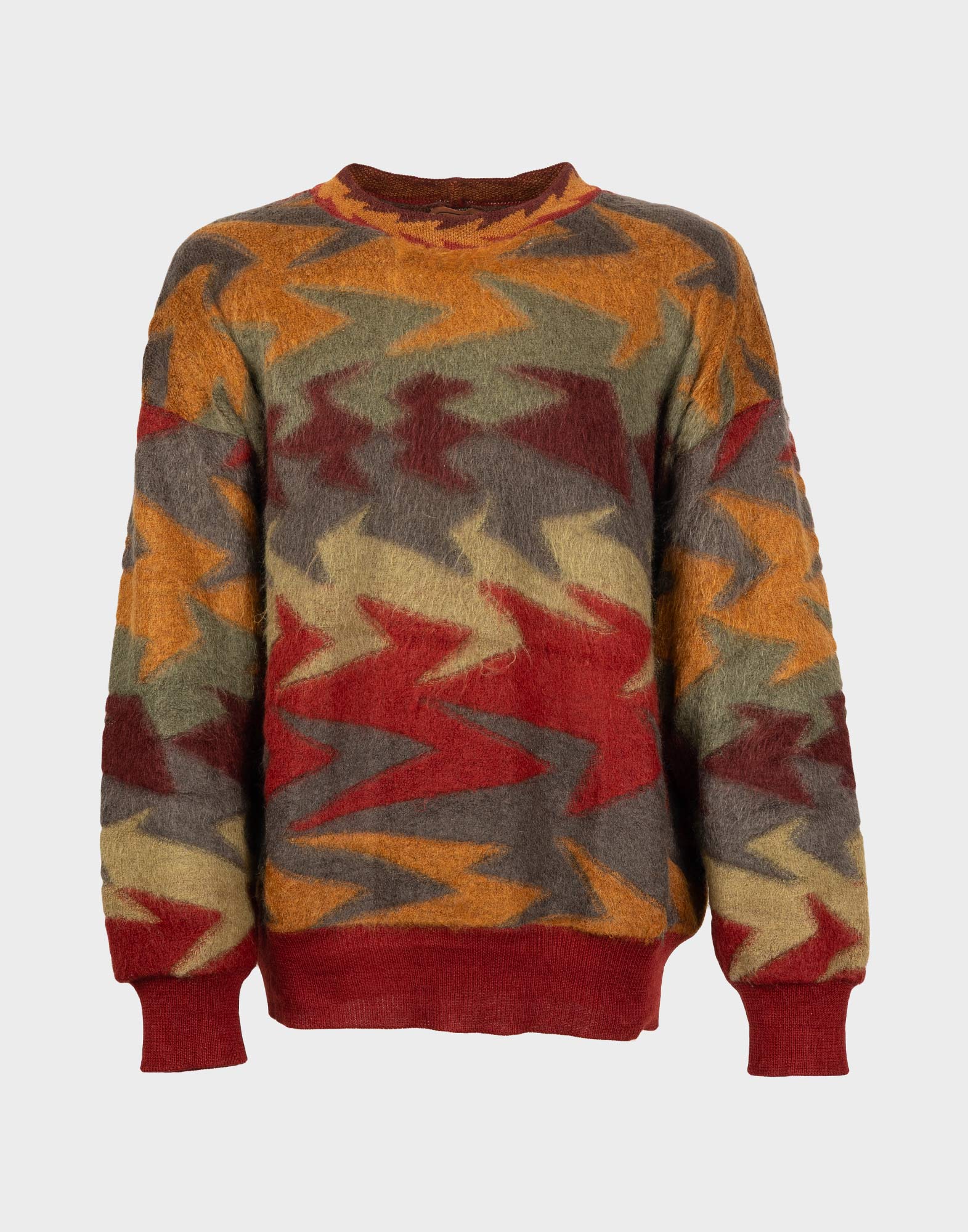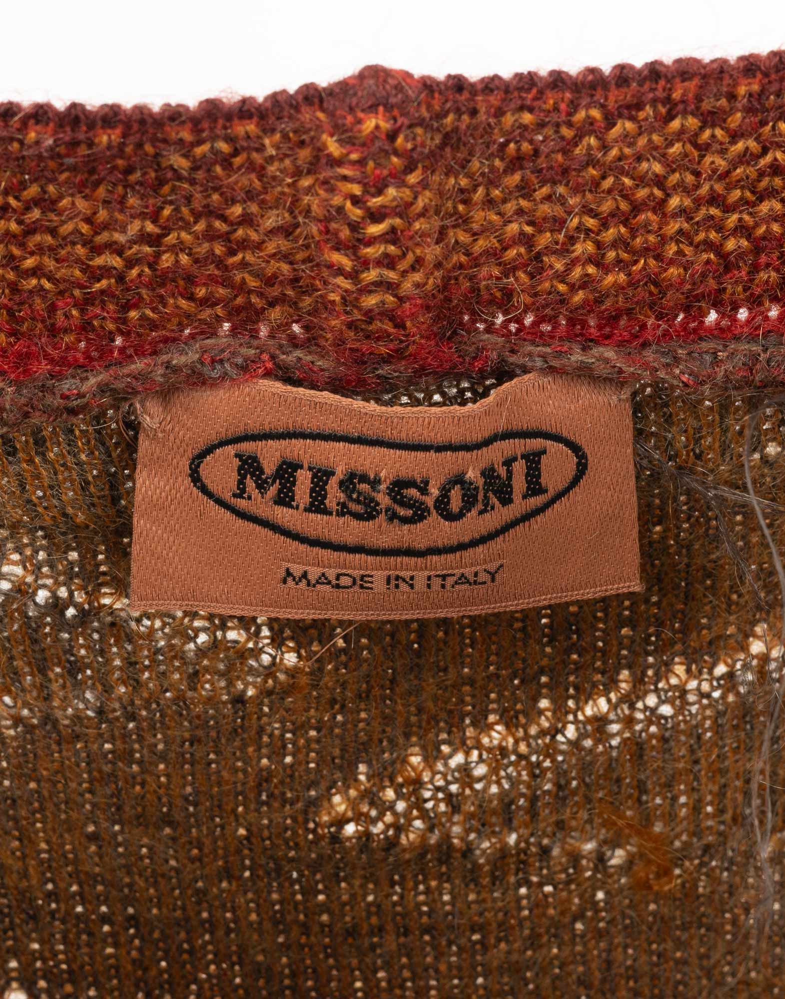 Missoni maglione da uomo anni ’90 realizzato in 70% mohair e 30% nylon con fantasia multicolore sulle tonalità terra. Taglia 52.