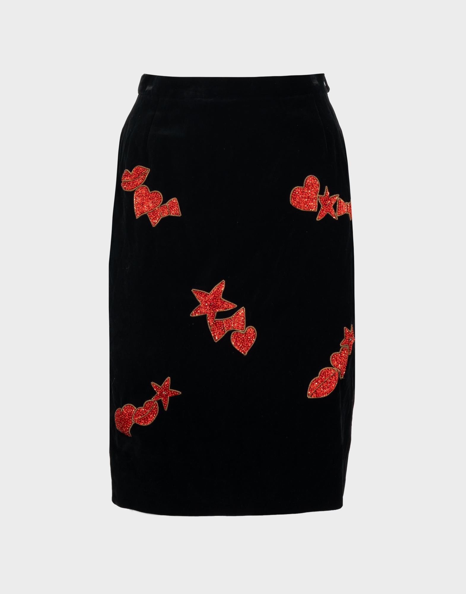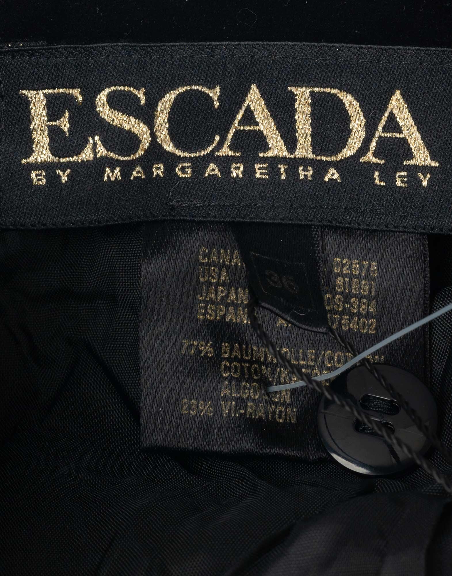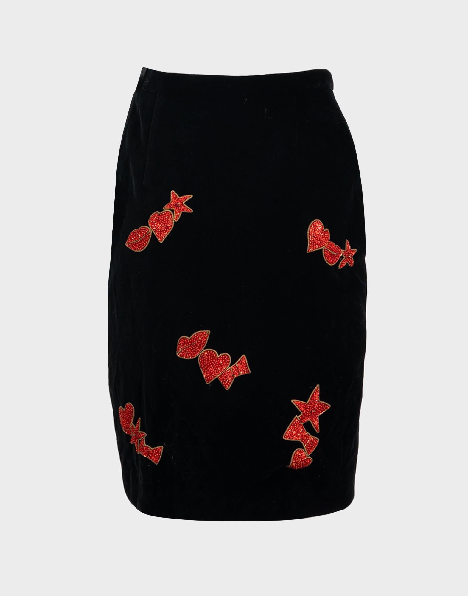 Escada, gonna a vita alta realizzata in cotone. Tessuto in velluto nero e disegni con applicazioni. Chiusura laterale con zip e bottone. Taglia 40IT.