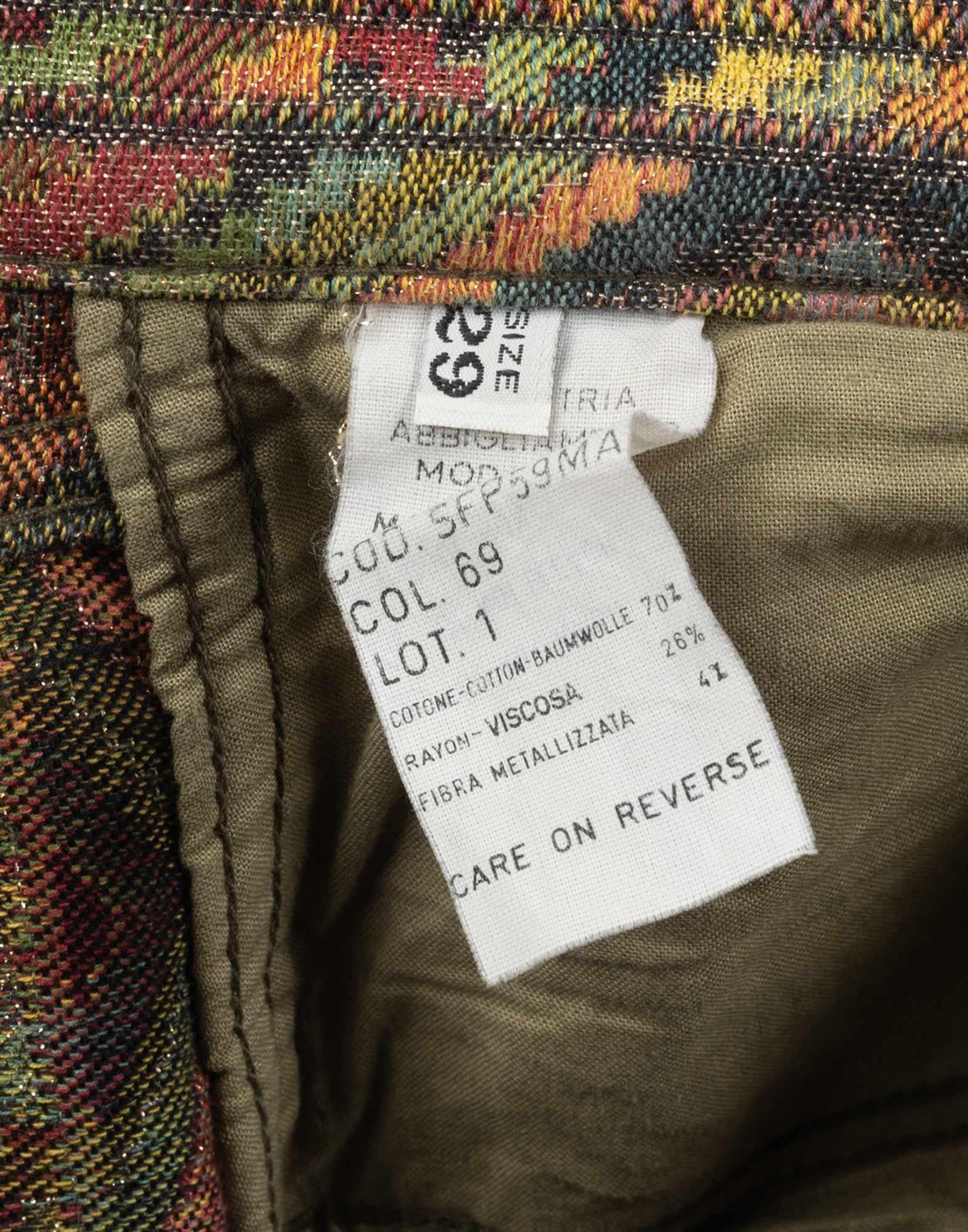 Moschino Jeans, pantaloni anni '90 a vita alta con fantasia etnica realizzati in cotone e fibre metalliche. Taglia W29.