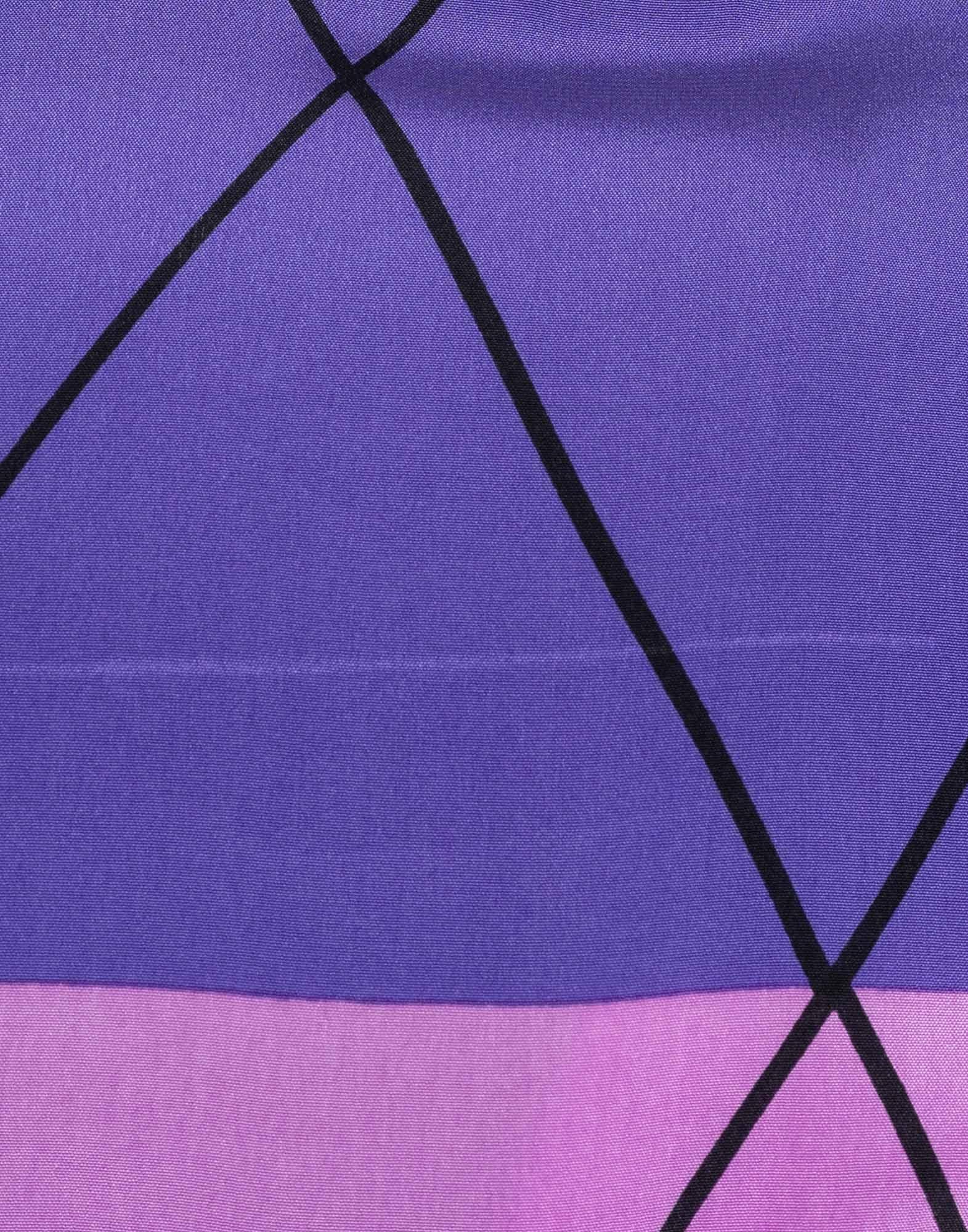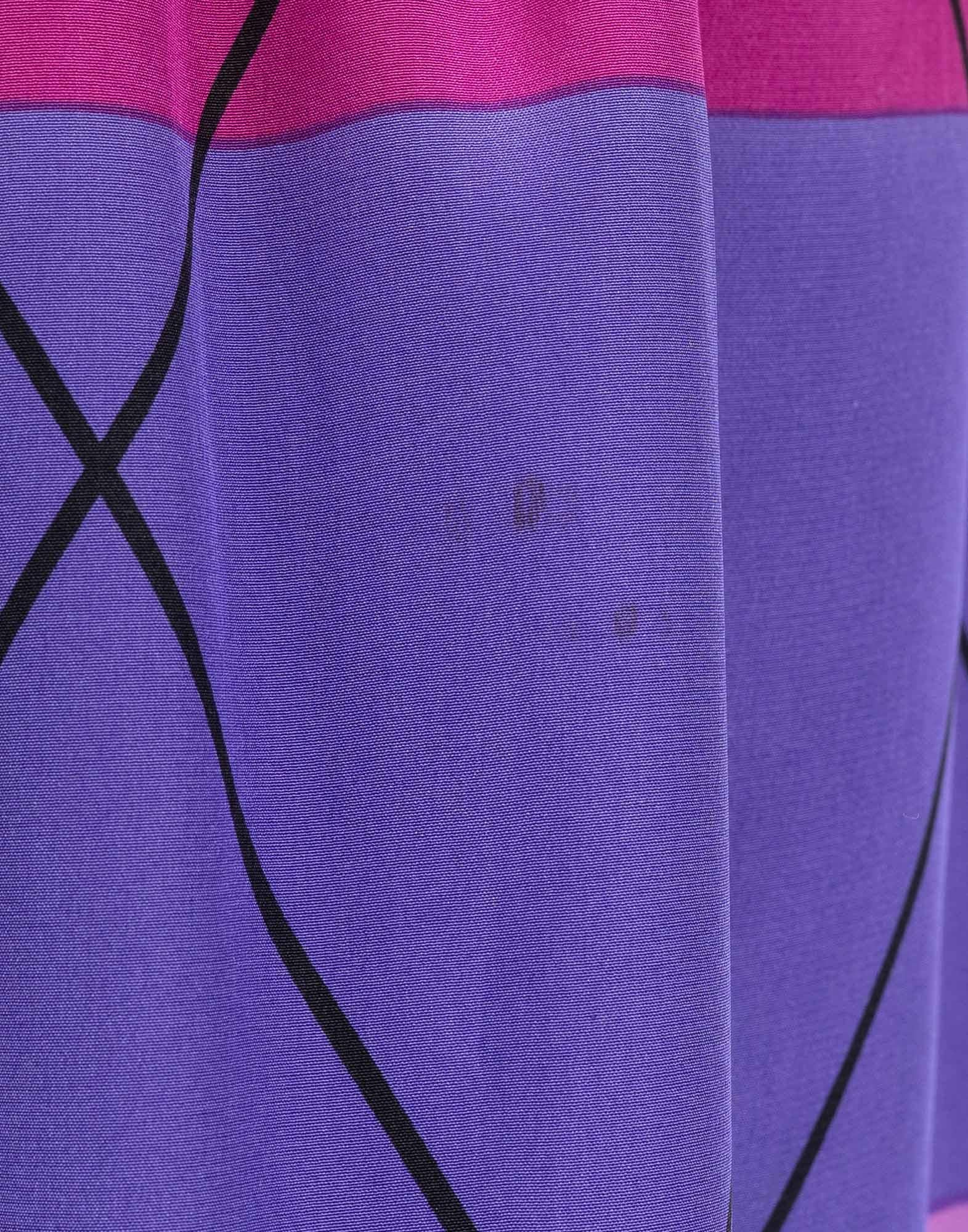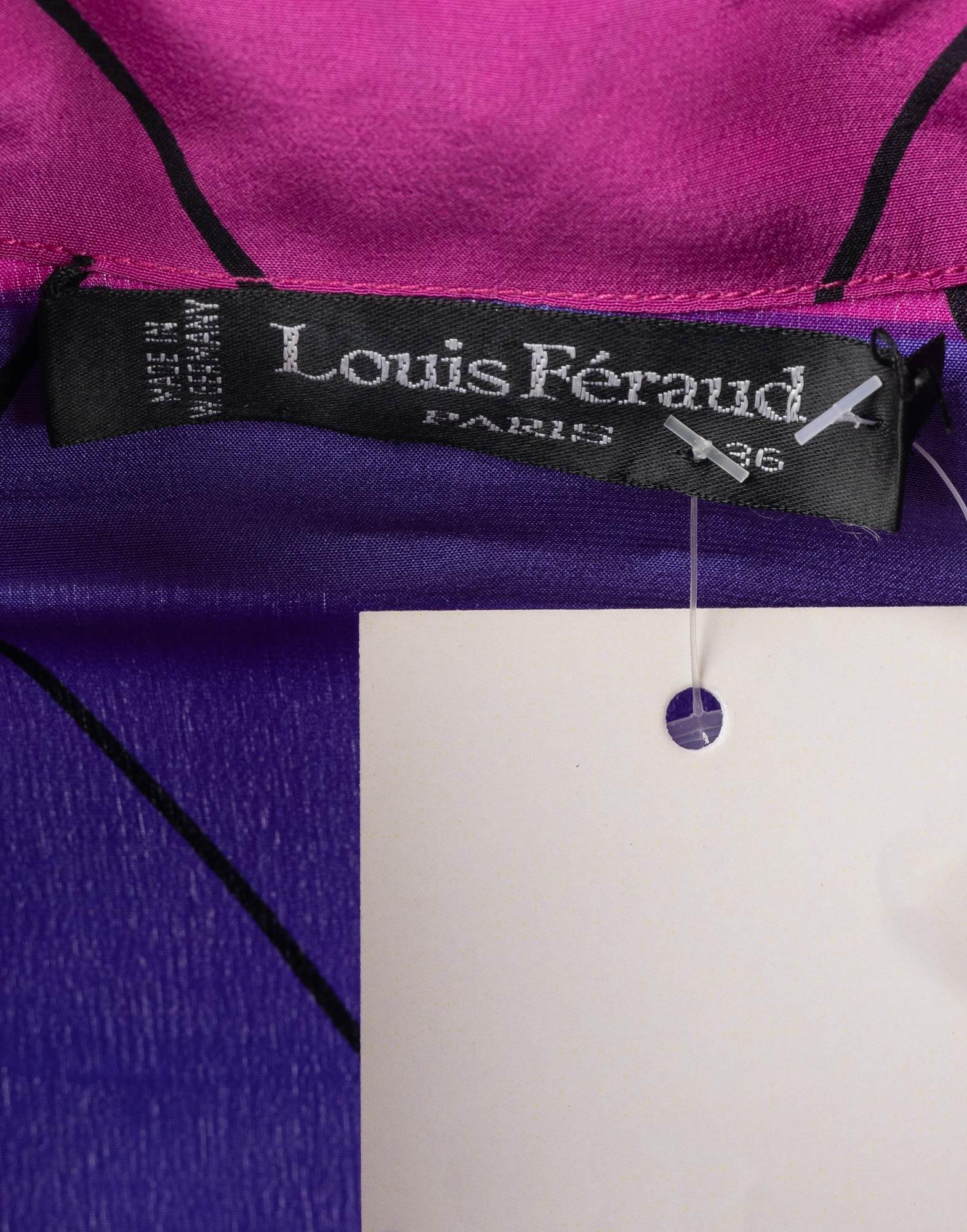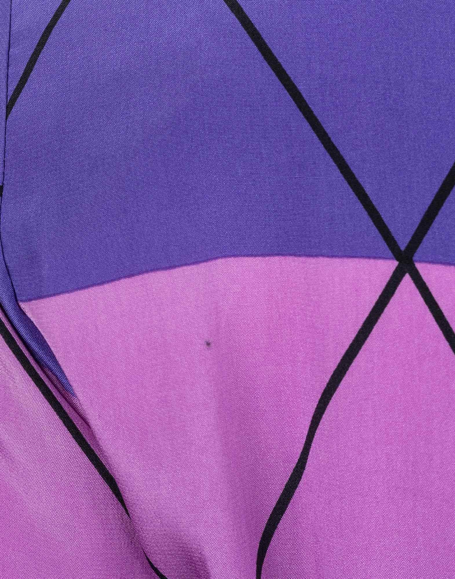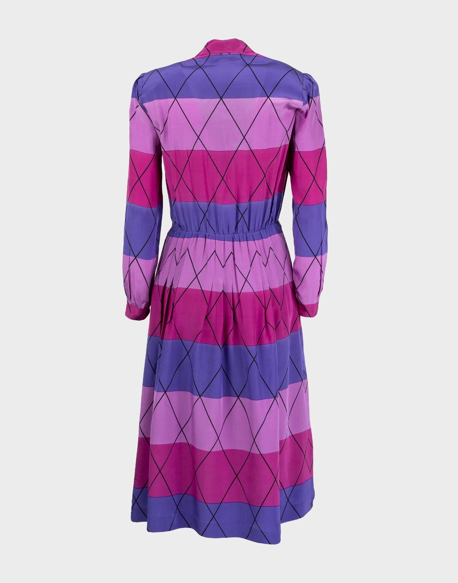 Louis Feraud, abito chemisier anni '80 in 100% seta con fantasia a quadri rosa e viola. Bottoni sul davanti, fiocco al collo e vita elastica. Taglia 36FR.