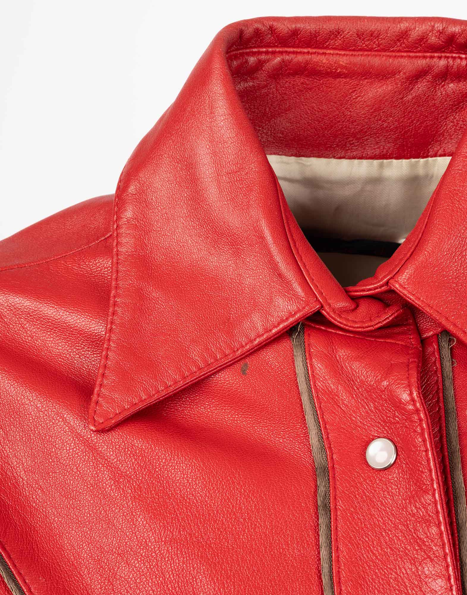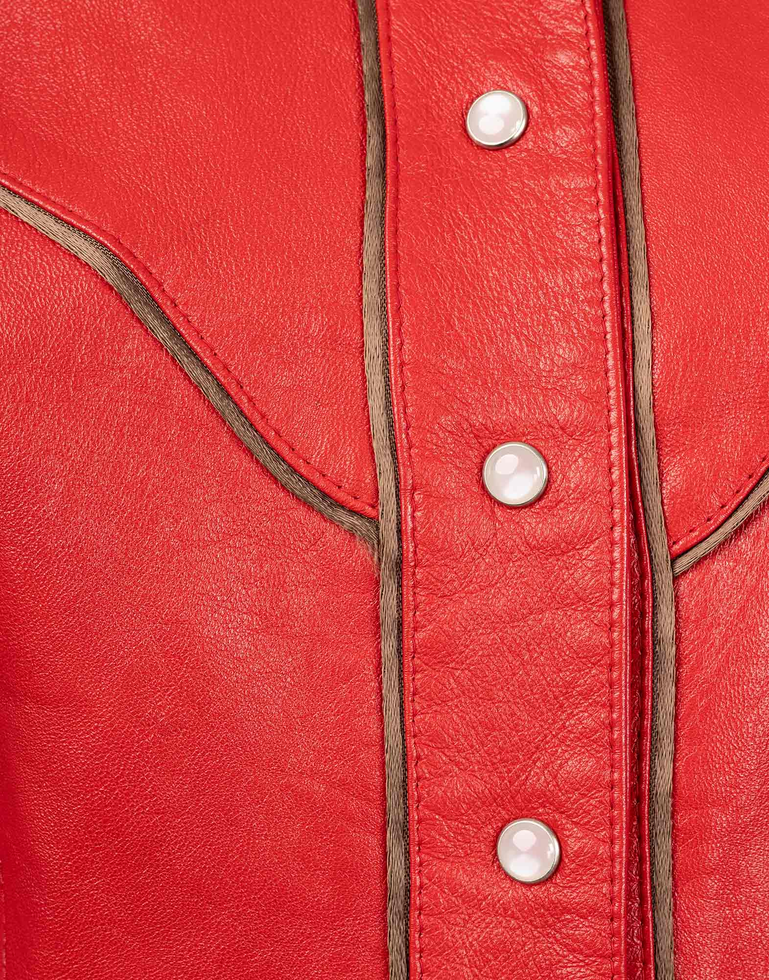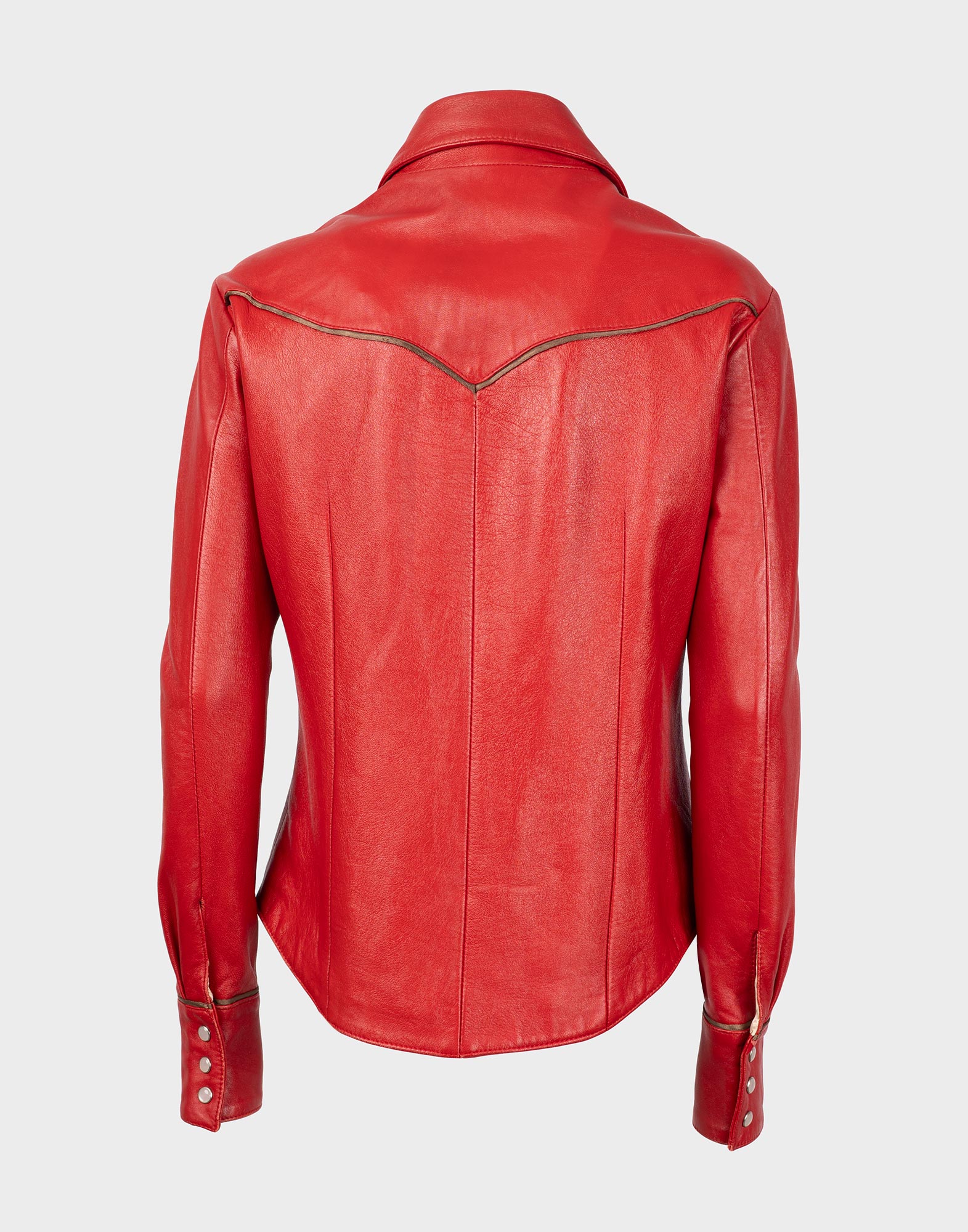 Camicia rossa in pelle anni 2000 dallo stile western. Caratterizzata da cuciture decorative sul carrè anteriore. Chiusura con bottoni a pressione. Taglia M.