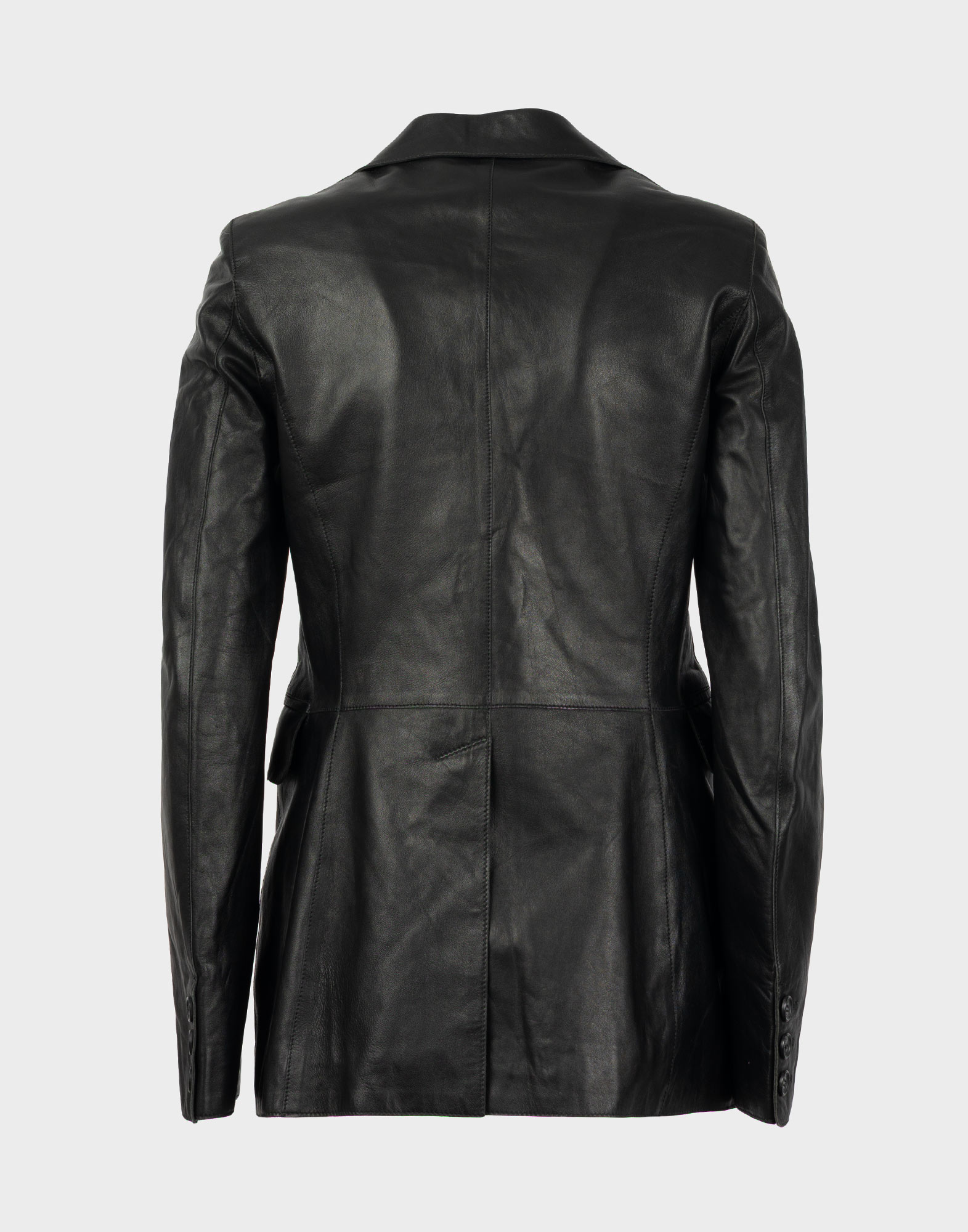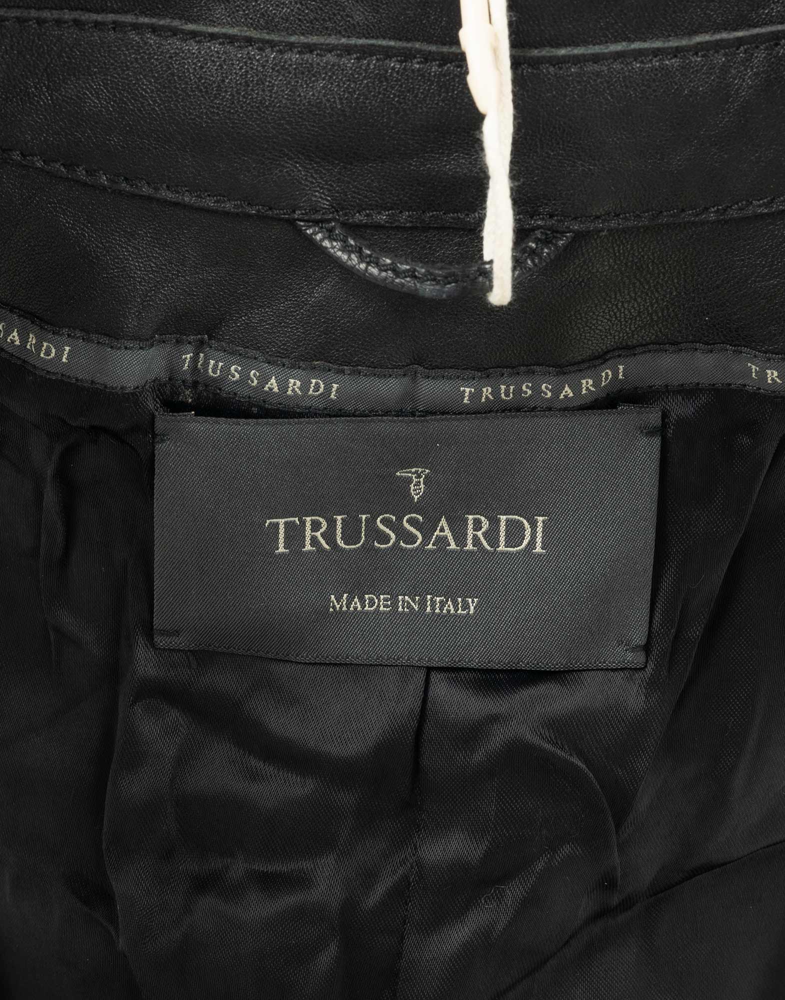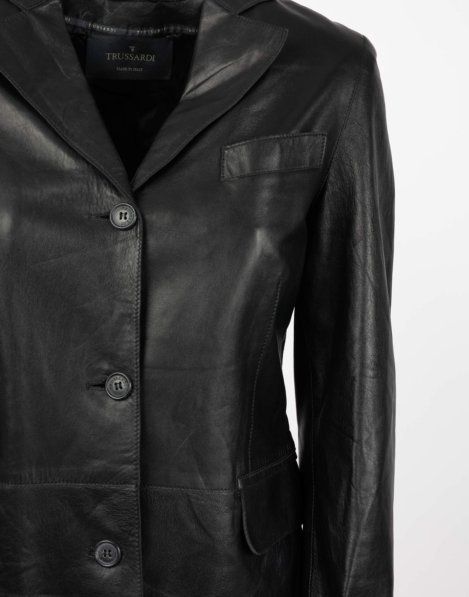 Trussardi giacca da donna realizzata in vera pelle nera. Chiusura monopetto con bottoni, vestibilità aderente. Taglia 40.