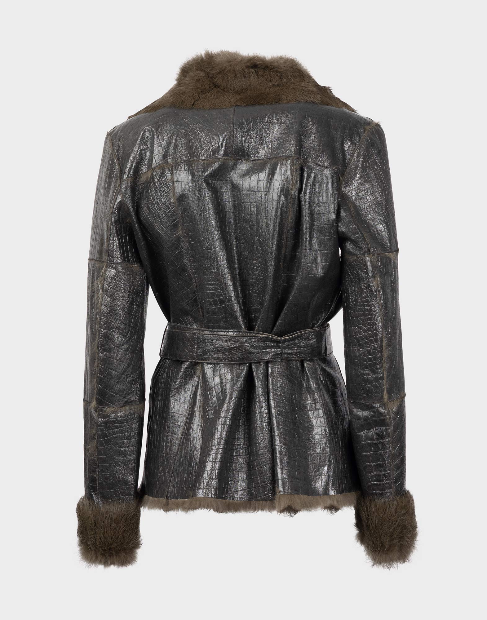 Giubbotto da donna anni 2000 realizzato in vera pelle con colletto e polsini a contrasto in pelliccia. Chiusura laterale con bottoni e cintura in vita. Taglia S.
